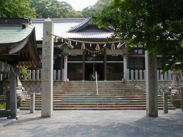 清和天皇貞観2年(860)、神功皇后の御甲(おんかぶと)をご神体として創建したと伝えられています。昭和33念、ご鎮座1100年大祭が挙行されました。桜門の設計は藤原期風の珍しいもので、境内には火野葦平、川江直種、本居宣長の歌碑があります。